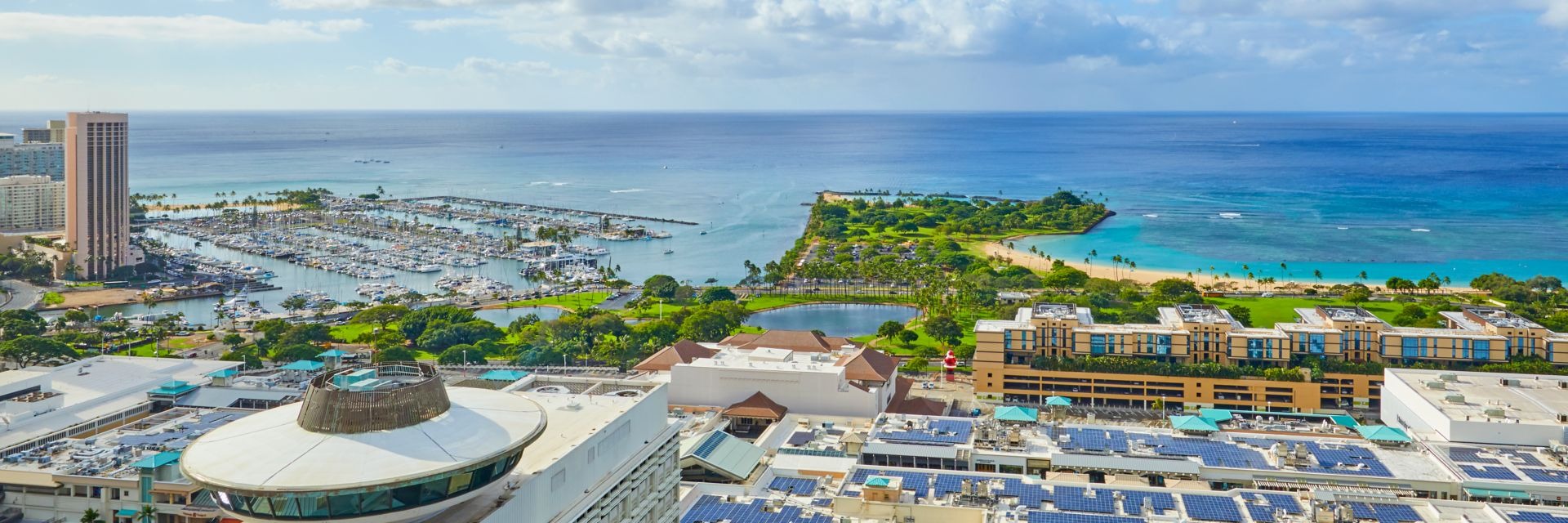 다운타운 호놀룰루의 호놀룰루 항구에 자리해 와이키키에서 서쪽으로 15분이면 도착하는 알로하 타워는 하와이의 상징과도 같은 곳입니다. 1926년 9월 완공된 이곳은 40년 동안 하와이 제도에서 가장 높은 건축물이었으며, 타워를 장식하는 시계는 미국에서 가장 큰 시계 가운데 하나입니다. 오래전 오아후가 뱃길을 통해서만 갈 수 있는 곳일 때 여행자를 반갑게 맞이하는 의미로 이 타워가 건설되었습니다. 듀크 카하나모쿠는 이곳 피어 7에서 처음으로 세계 신기록을 세웠으며, 이곳 부두 또한 오아후를 방문하는 선박을 열렬히 환영하는 이벤트인 보트 데이로도 유명합니다.