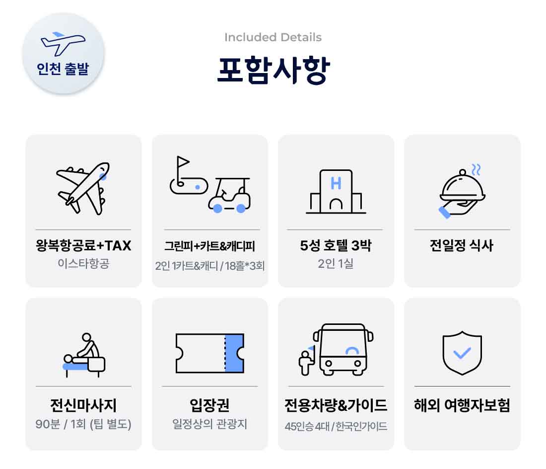 - 공항 ↔ 호텔 왕복차량 , 골프장 왕복 차량 이용 3회