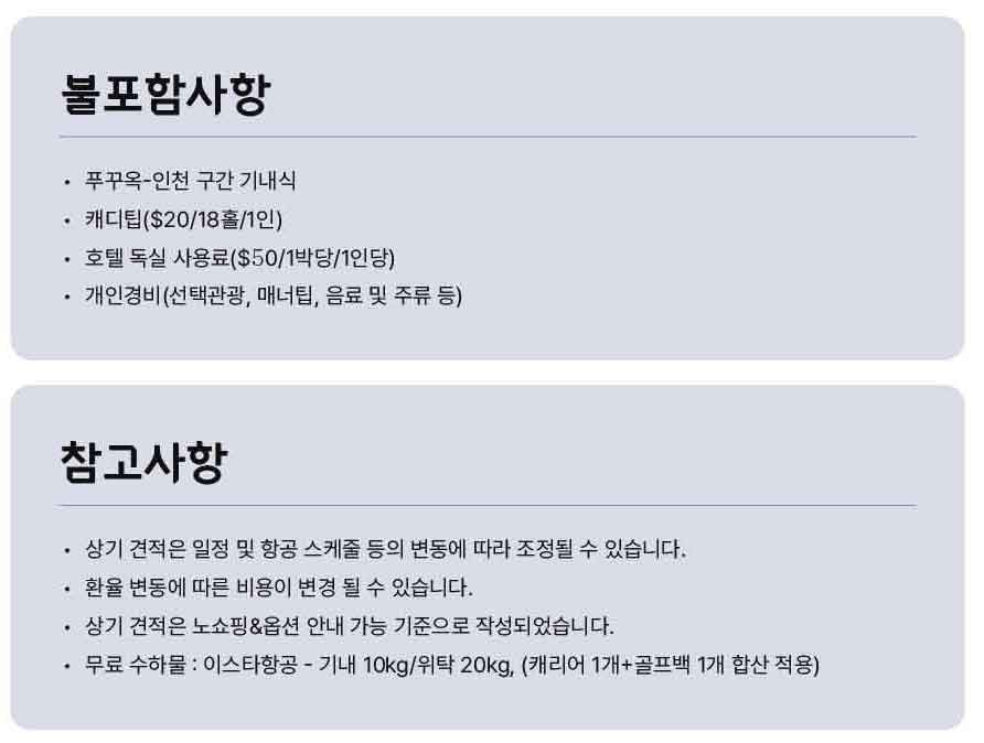 - 위탁수하물은 항공사 규정에 따라 KE/OZ는 23kg / LCC(LJ/7C/TW/ZE/BX/RS 등) 15kg(골프백1개+일반가방1개 합산)/1인입니다. 초과시 항공사 수수료 추가 발생합니다.